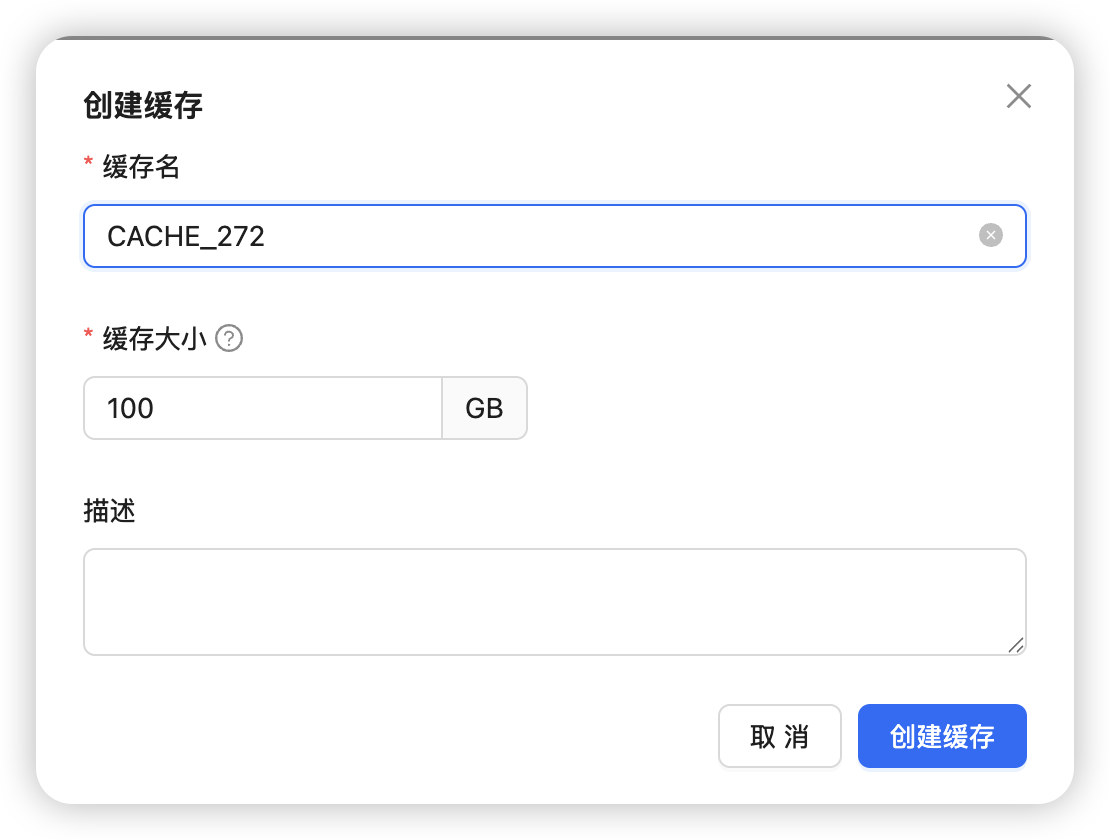 在"数据"->"缓存"页面,可以新建 Cache,最小空间为 100G,步长为 10G,建议初始使用空间为冷存/湖存储的 1/10,后续按需扩大缓存大小。