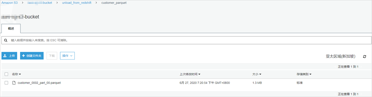 IAM_ROLE 'arn:aws-cn:iam::xxxx:role/redshift_s3_role';- 执行成功后,您可以在对应Bucket中查看导出的文件。PARQUET文件数据压缩率更高,查询速度更快。